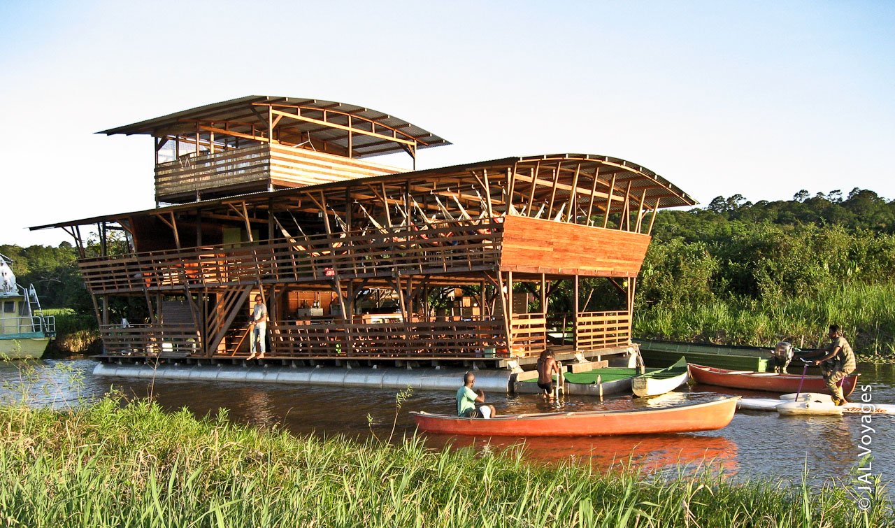 Jean-Louis Antoine, le fondateur de l’agence d’écotourisme JAL Voyages, a quant à lui eu l’idée de créer un éco-lodge flottant au cœur de la réserve naturelle des Marais de Kaw, en Guyane. Cette structure à trois étages a été construite essentiellement avec du bois local et propose une véritable plongée dans l’environnement naturel des marais.